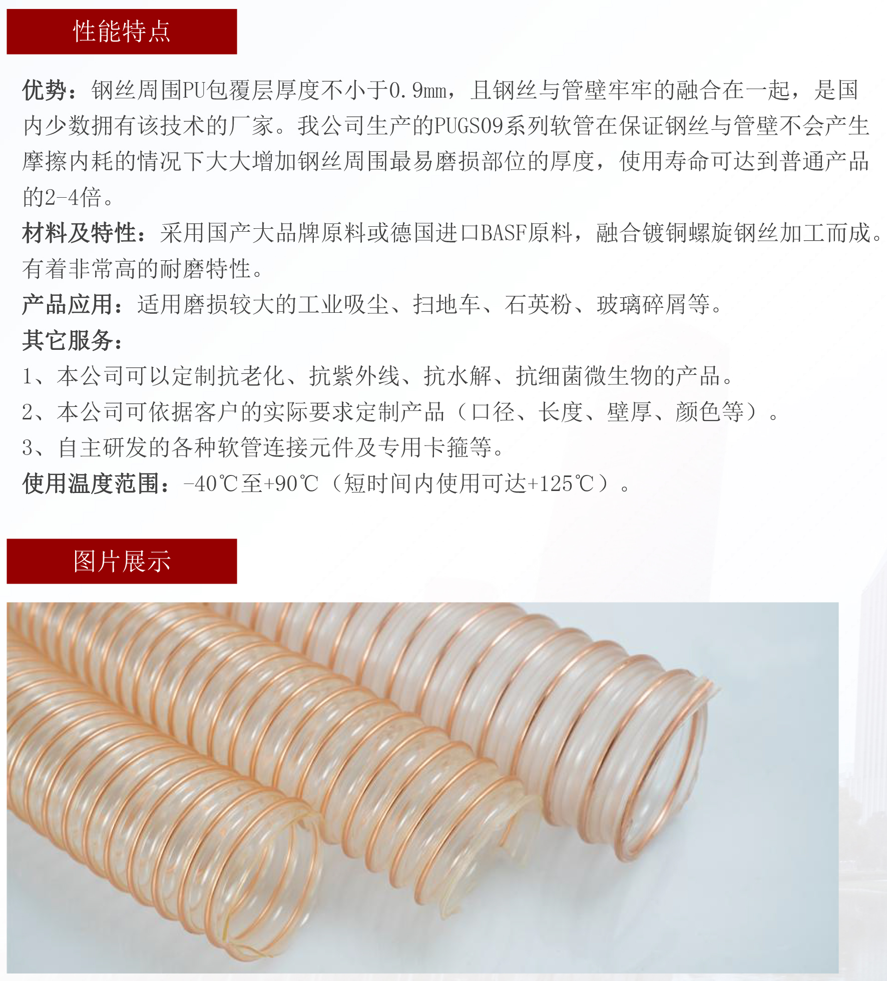 材料特性:德國進(jìn)口BASF原料,融合鍍銅螺旋鋼絲加工而成,有著非常高的耐磨特性。產(chǎn)品應(yīng)用:適用磨損較大的工業(yè)吸塵、掃地車、石英粉、玻璃碎屑等。