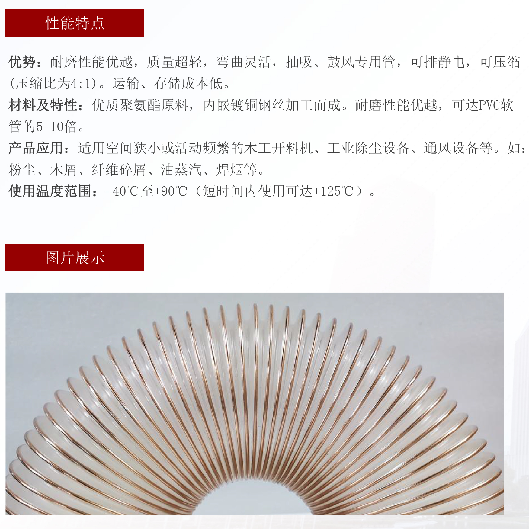 材料特性:優(yōu)質(zhì)聚氨酯原料,內(nèi)嵌銅鋼絲加工而成,耐磨性能優(yōu)越,可達PVC軟管的5-10倍。產(chǎn)品應用:適用空間狹小或活動頻繁的工業(yè)除塵設備、通風設備等。如:粉塵、木屑、纖維碎屑、油蒸汽、焊煙等。